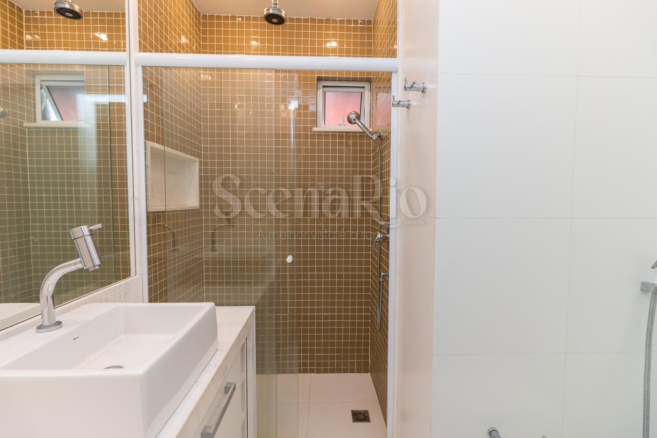 No interior, o living integrado em porcelanato cria ambientes amplos para receber amigos e familiares, enquanto a cozinha com armários planejados e despensa facilita a organização no dia a dia. São cinco banheiros bem distribuídos, incluindo lavabo e dependências completas de empregada, além de área de serviço equipada com máquina de lavar. Ar condicionado em todos os cômodos, elevador moderno, jardim interno de inverno, salão de festas e playground elevam ainda mais o padrão de conforto. Cada detalhe — do fogão à geladeira de alta performance — reforça o estilo de vida prático que Ipanema oferece.